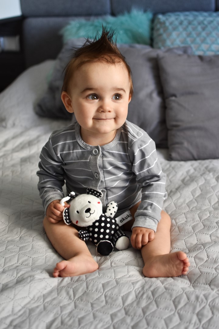Ασπρόμαυρη κουδουνίστρα σε σχέδιο αρκουδάκι. Μια διασκεδαστική κουδουνίστρα φτιαγμένη από μαλακά υλικά για να αναπτύσσει την αίσθηση της αφής.