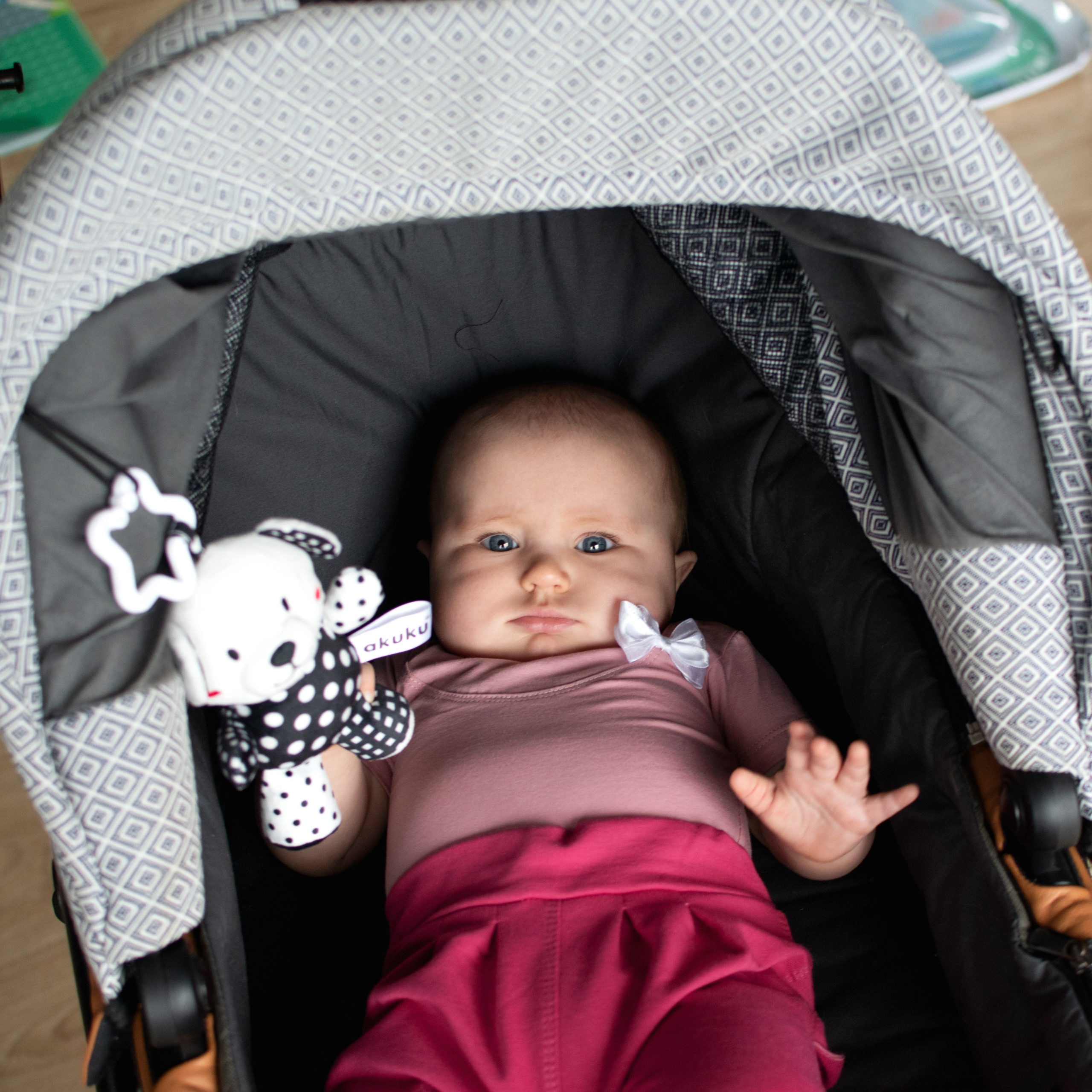 To Λούτρινo έχει στο εσωτερικό του μικρές πολύχρωμες μπαλίτσες που κροταλίζουν και παράγουν ήχο για να το διασκεδάζουν. Σε ασπρόμαυρα χρώματα για να οξύνει την όραση του μωρού.