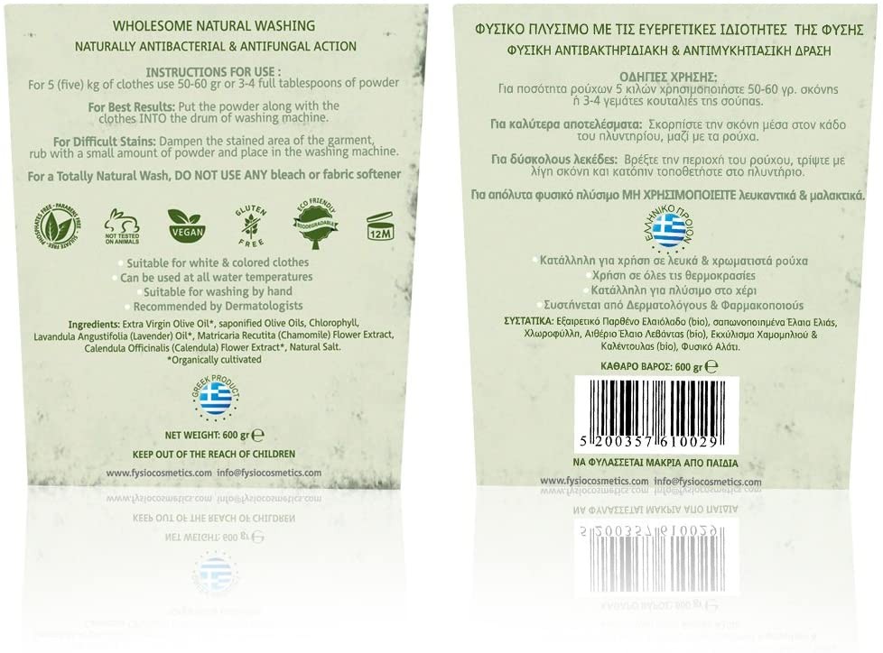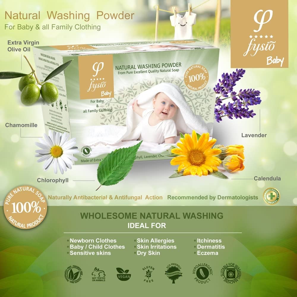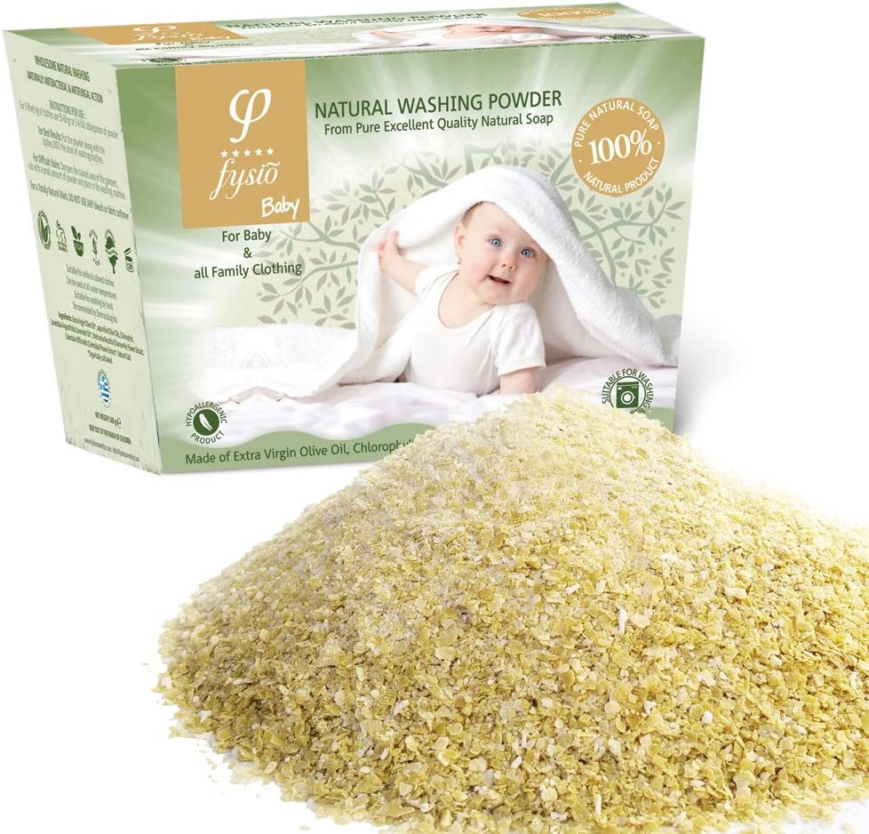 Η φυσική σκόνη πλυσίματος βρεφικών – παιδικών ρούχων Fysio, προέρχεται από 100% Αγνό Τριμμένο Φυσικό Σαπούνι Εξαιρετικής Ποιότητας, φτιαγμένο από Εξαιρετικό Παρθένο Ελαιόλαδο, Χλωροφύλλη, εκχυλίσματα βοτάνων και αιθέρια έλαια.